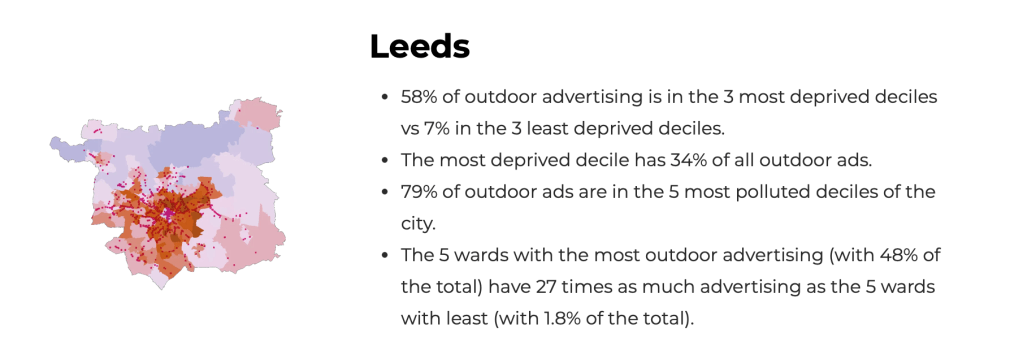 Adfree Cities has conducted a first-of-its-kind national survey of roadside advertising to demonstrate a national trend in which advertising in public space is disproportionately located in more deprived and more polluted areas.