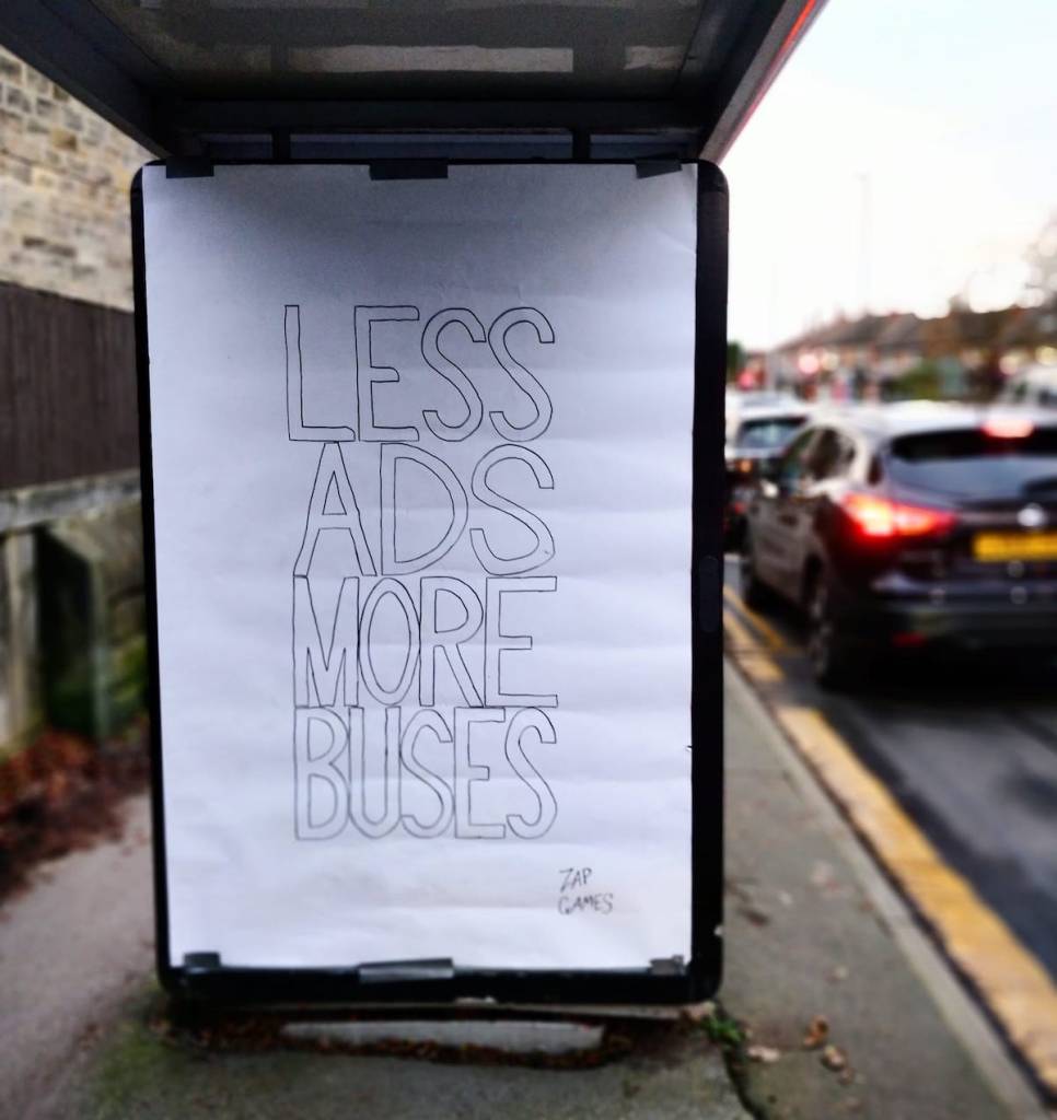 With a second message, Less Ads, More Buses the ad hacks also tap into the question of advertising’s role within transport infrastructure. Why are bus networks in the UK a. getting ever shitter and b. covered in promotions for unhealthy and energy intensive ultra-processed food and cars? What are our priorities? Could things be different?